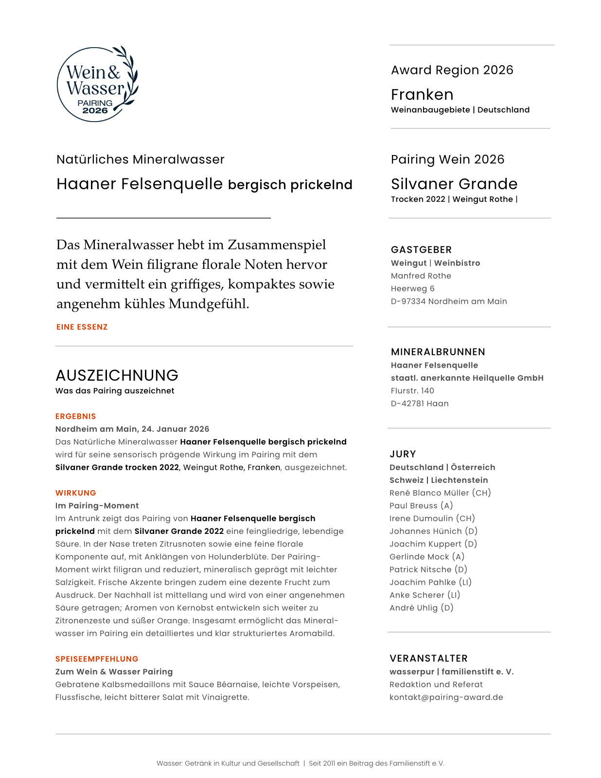 Bei der Premiere des Wein & Wasser Pairing Awards 2026 im Weingut Manfred Rothe wurde das natürliche Mineralwasser Haaner Felsenquelle bergisch prickelnd für seine sensorisch prägende Wirkung im Pairing mit dem Silvaner Grande 2022, trocken ausgezeichnet.